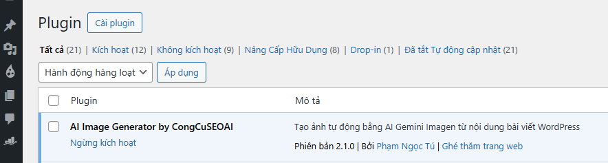 ai-image-generatorđã giải nén vào đường dẫn/wp-content/plugins/. - Bước 3: Kích hoạt plugin. Truy cập vào trang quản trị WordPress, điều hướng đến mục Plugins và kích hoạt plugin "AI Image Generator".