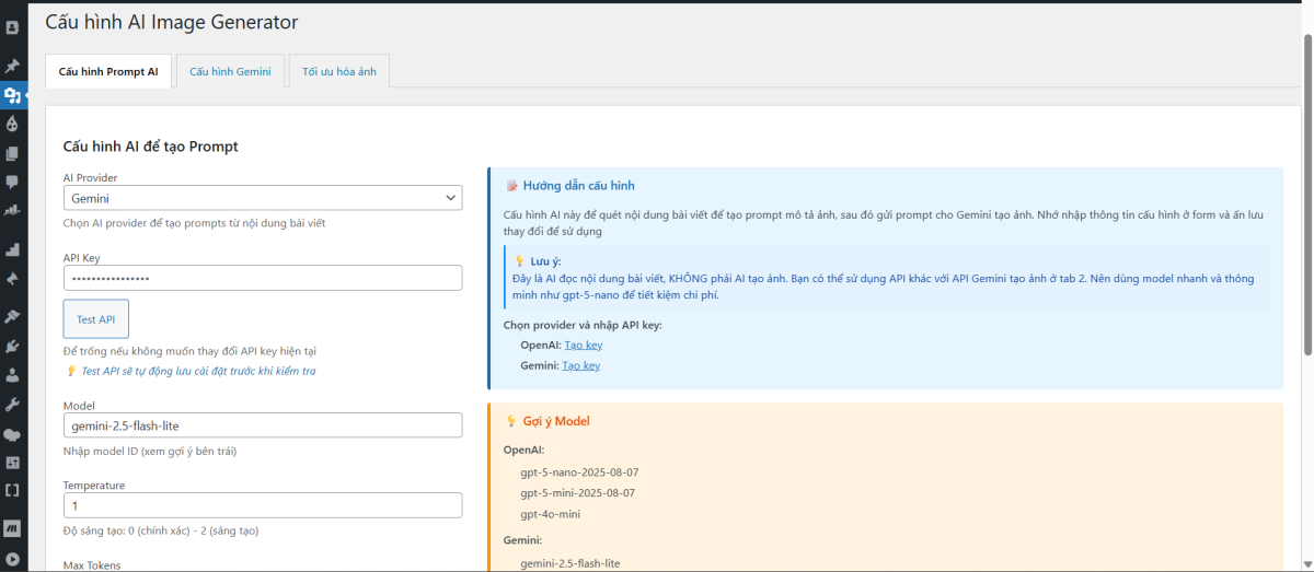 - Custom System Prompt (Tùy chọn): Mặc định, plugin sử dụng một system prompt đã được tối ưu sẵn. Tuy nhiên, bạn có thể tùy chỉnh nếu muốn thay đổi hướng dẫn cho AI, ví dụ: "Bạn là chuyên gia tạo prompt cho AI tạo ảnh. Phân tích nội dung và tạo prompts chi tiết bằng tiếng Việt, mô tả rõ chủ đề, phong cách, màu sắc, cảm xúc."