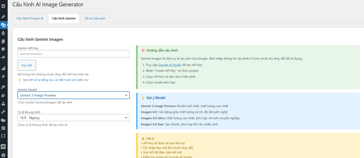 Tab này dành riêng cho việc cấu hình Gemini Imagen, công nghệ chính để tạo ra hình ảnh.