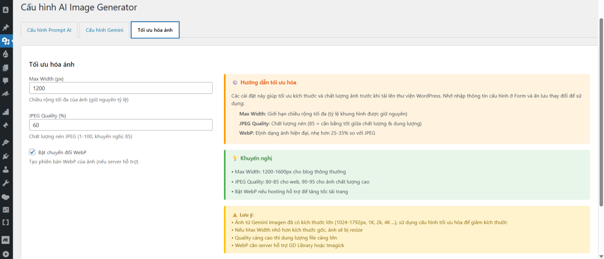 - Enable WebP Conversion: Tùy chọn này cho phép bạn bật/tắt việc chuyển đổi ảnh sang định dạng WebP. Việc sử dụng WebP có thể giúp giảm kích thước tệp ảnh từ 25-35% so với JPEG, từ đó cải thiện đáng kể tốc độ tải trang.